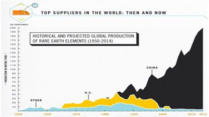This chart shows a history of rare earth element production, in metric tons of rare earth oxide equivalent, between 1950 and 2016. It clearly shows the United States' entry into the market in the mid-1960s when color television exploded demand. When China began selling rare earths at very low prices in the late-1980s and early-1990s, mines in the United States were forced to close because they could no longer make a profit. When China cut exports in 2010, rare earth prices raised steeply. That inspired new manufacture in the United States,Russia, Australia,Malaysia, Thailand and other countries. In 2016, rare earth production in the United States stopped as the only remaining mine was put on care and preservation.
